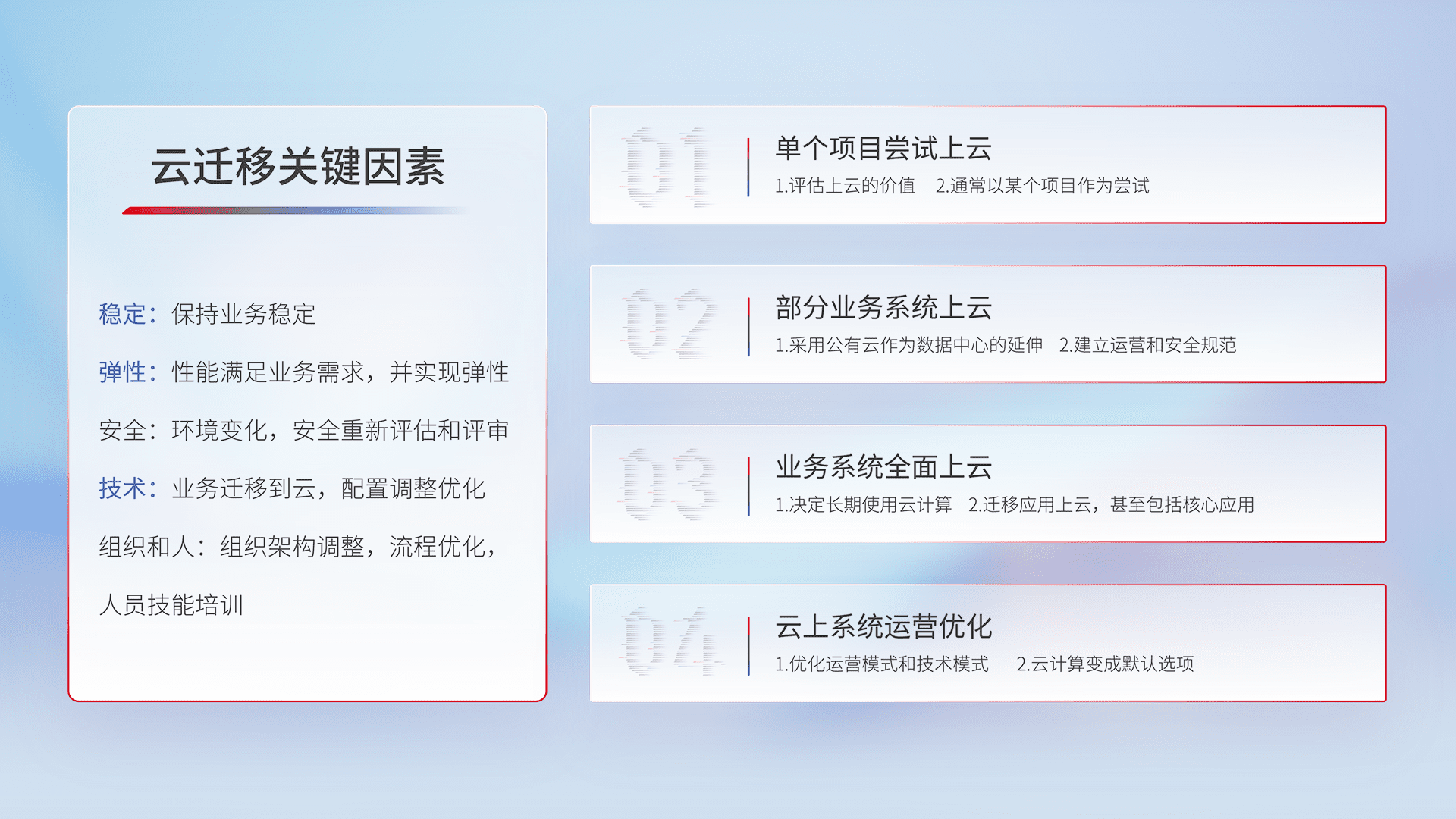 结合实际业务,,从规划设计、、、云平台选型、、、云原生改造、、数据迁移、、、集成交付,,迁移全过程为客户识别最佳上云路径,,做好风险识别管理,,,,设计网络架构、、身份权限、、安全审计合规、、、、操作审计、、、、日志审计、、监控告警策略、、、多站点容灾设计等,,,对云上基础设施进行整体规划,,,提升IT治理水平,,以满足弹性、、、高可用、、、、高性能的需求。。。。